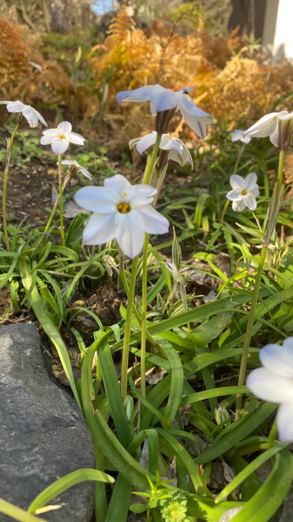 Then, amidst the momiji’s branches, delicate white flowers began to emerge, seemingly overnight, from what I had previously dismissed as long, grass-like weeds. Initially, I ignorantly plucked them out, only to be surprised by their unmistakable scent of leek and onions. Perplexed, I turned to Google Lens, which identified them as Springstar (Ipheion uniflorum), a flower native to South America. My mother-in-law revealed that this flower had graced our garden for years, prompting me to ponder its unexpected presence in our midst.