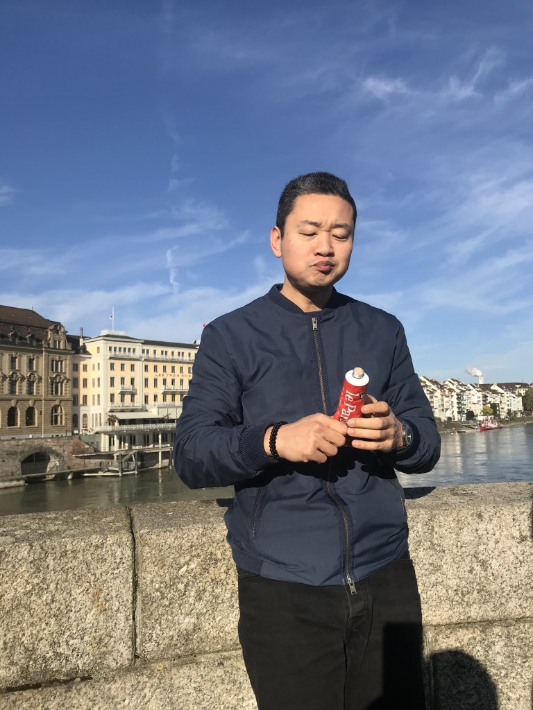 Moving on, I love Landjรคger, a type of Swiss salami that was my perfect picnic food during school hiking trips in Switzerland. It has a delightful smoky and savory flavor. During my last visit to Basel, I went straight to Migros and enjoyed a Landjรคger on the Mittleri Bruck after arriving at Basel-Mulhouse-Freiburg Airport. Hiromi managed to capture a charming picture of me while I was eating Landjรคger.