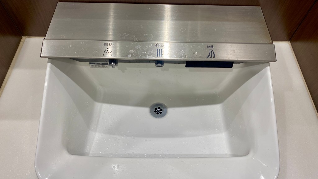 Touchless water features are common in Japanese toilets, but this washlet took it to another level. To the left of the water outlet was an automated soap dispenser, also touchless! On the right side, I discovered an automatic hand dryer, once again touchless.