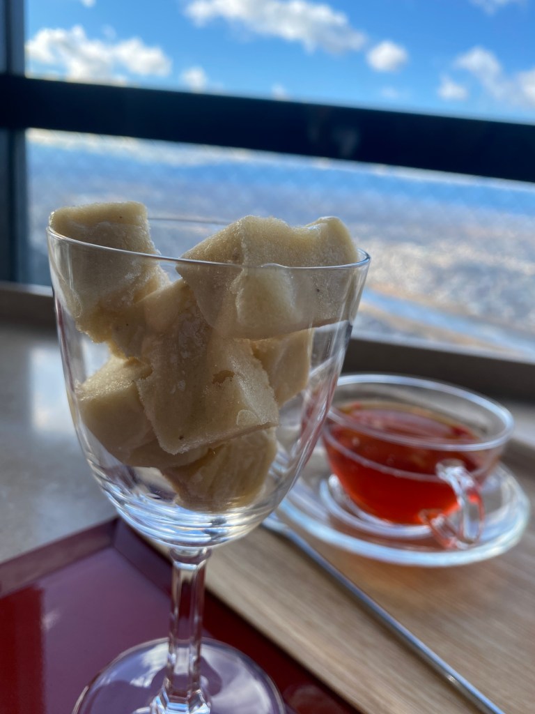 To our delight, Le Pont de Ciel was open, welcoming us with a cozy atmosphere perfect for enjoying a cup of tea paired with a Japanese snack. Imagine our surprise when we spotted Nobunaga bananas on the menu! Without a moment’s hesitation, we placed our order, our excitement bubbling over at the thought.
