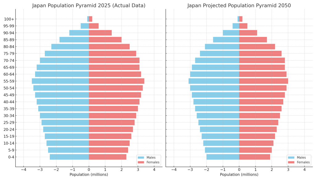 As of 2025, Japan’s population pyramid reveals a stark reality. The baseโ€”the youngest age groupsโ€”is narrow. Fewer children are being born each year, with the fertility rate sitting at a record low of 1.15. Meanwhile, the top of the pyramidโ€”the elderlyโ€”is expanding rapidly. Approximately 29% of the population is over 65, making Japan one of the oldest countries in the world.