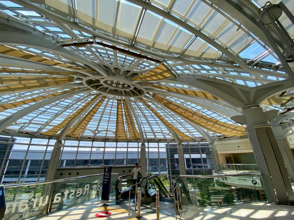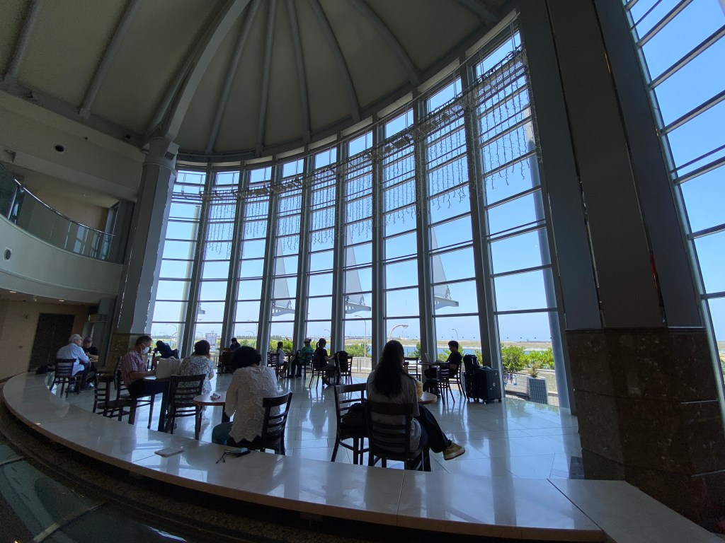 We passed through a roadside service area just before reaching the airport, and it was no ordinary rest stop. The building was a bold architectural statementโpart lookout tower, part dining hub, with panoramic views of Osaka Bay and the vast mechanical sprawl stretching toward the sea. It made me feel like I was already somewhere far away, even before setting foot in the terminal.