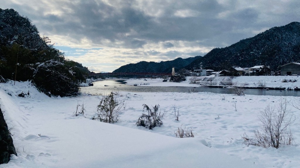 Not far from there flows the Nagara River. The banks were covered in snow, the mountains in the distance were dusted in white, and everything felt calm and still. One of those winter days where sound seems to be absorbed by the landscape.
