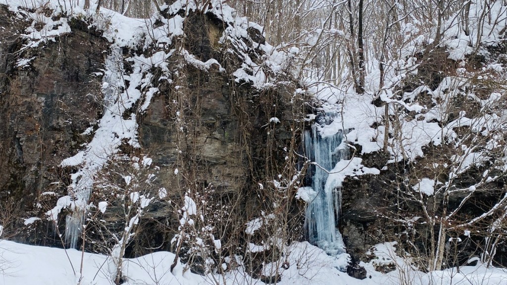 No frozen waterfalls hidden in forest cliffs.